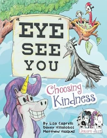 EYE SEE YOU: Choosing Kindness is a vibrant picture book blending humor, art, and heartwarming lessons. Follow Woof the Crow and Unicorn Jazz as they dive into an inspiring, fun-filled adventure with joy and kindness! This story uses clever and engaging illustrations to show the power of kind choices over hurtful words. A must-read for children, families, and educators, it’s a tale about celebrating being unique and kind to all. EYE SEE YOU: Choosing Kindness is an inspiring children’s story that school counselors and therapists approve for making good choices and speaking up for those who may feel like they don’t have a voice. A kindness book, Unicorn Jazz is an award-winning unicorn book series and named the most unique unicorn in the world! A book showing that we can make good choices when speaking up or helping others with graphic novel-like art. Encouraging confidence, play & and imagination. Watch this story as a read aloud at: https://youtu.be/sD25TDzy2LE Unicorn Jazz popular children’s books are being turned into a cartoon series, Woof the Crow comes back with another heart-to-heart conversation with Jazz … and it all began the moment he put on his first pair of eyeglasses. In addition to finding out more about Woof the Crow’s background and family, EYE SEE YOU comes packed with new animal friends like Bee Happy Asia the Flamingo , Trezekke Zebracorn and more! EYE SEE YOU: Choosing Kindness is a picture book that teaches kids to be humble, confident, and proud of who they are, an inspiring children’s fable. Children and adults find humor in the art that kids who enjoy graphic novels appreciate, along with clever anecdotes throughout the story. Woof the Crow comes back with another heart-to-heart conversation with Jazz … and it all began the moment he put on his first pair of eyeglasses. This is also a timeless children’s book. A great topic for parents, teachers and educators in this anti-bullying children’s book, with characters showing choices a child can make to be nice versus choosing hurtful words. A great doctor visit book for kids especially when Woof the Crow brings out his glasses telling his animal friends, “”You get a pair, you get a pair, everyone gets a pair.”” EDITORIAL REVIEWS: “”We all need reminders about how to stay true to ourselves and respect others along the way. This story and series is so fun and inspiring and does exactly that! I highly recommend this book for kids and adults of all ages! Sit back, and enjoy this beautiful nudge to accept ourselves.”” -Alexis Maron, MA, RDT/BCT, RADT “”Written and illustrated with joy and kindness, EYE SEE YOU invites children to bring out the best in themselves, allaying fears and differences to celebrate their unique being! This little book is one fine marriage of artistry, writing, and caring; a complete conviction that every day can be beautiful.”” -Grady Harp, Hall of Fame Amazon Children’s Book Reviewer “”The best bullying books for kids, these kindness books for children’s messages give joy, meaning, and conversations about the power of words, including KINDNESS. This bully book for kids shows how to see not only with our eyes, but with our hearts and minds as well. -RS Brendan, Teacher “”I loved the reference to historical people who wore glasses. I was also happy to read that instead of fighting back with unkind words a gentleness and kindness in words was used to become friends with a former bully at school.”” -T. Young Find playtime puppets, coloring books, free printable coloring pages, teacher resources go to: UnicornJazz.com Author Lisa Caprelli is an inspirational school speaker and proudly does school author visits! —- ISBN: 9781951203108